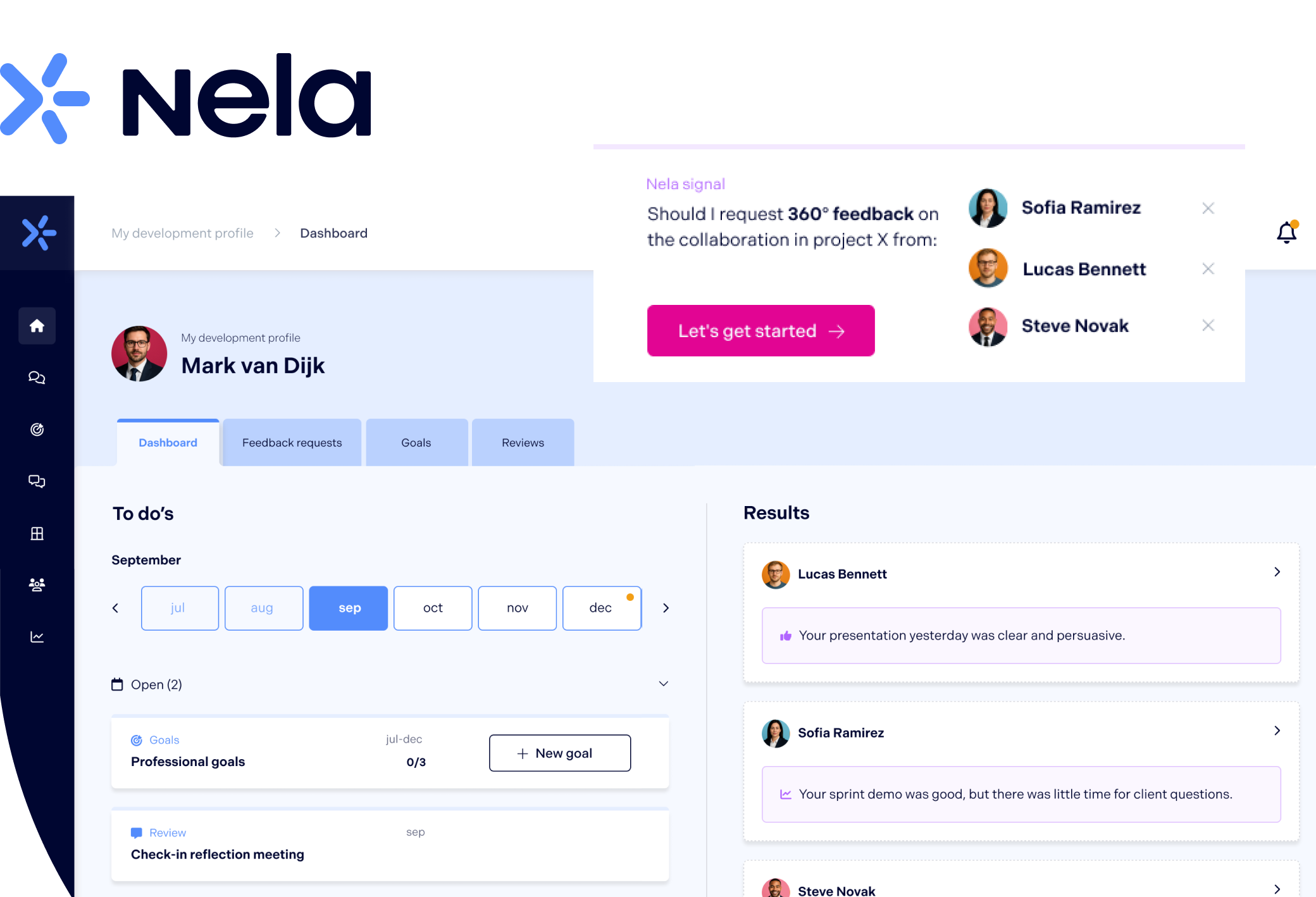 With goals & actions, you turn feedback into concrete steps and measurable objectives. The reflection module offers structured moments of evaluation and clear insights. In this way, feedback becomes the driving force behind sustainable development within teams, projects, and organizations.